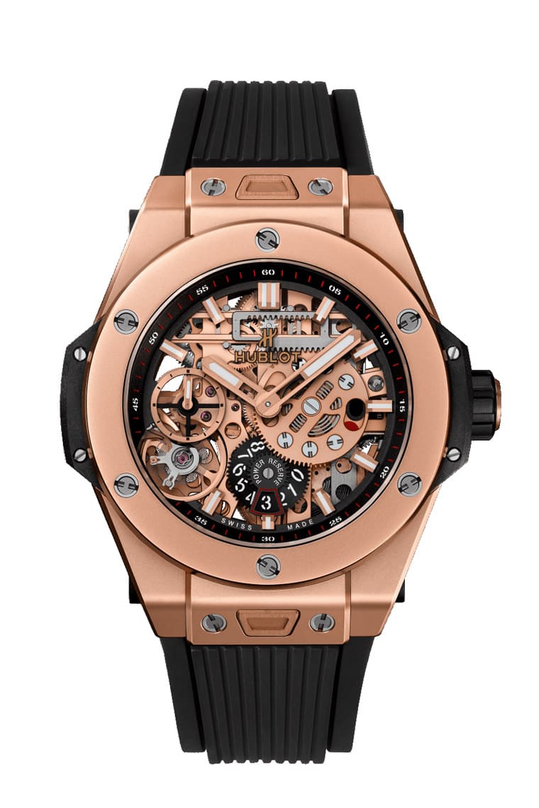 18K皇金材質/HUB1201手動上鍊機芯/時、分顯示/動力儲存顯示/藍寶石水晶鏡面、透明底蓋/防水100米/錶徑45mm/參考價:NT$ 1,273,000