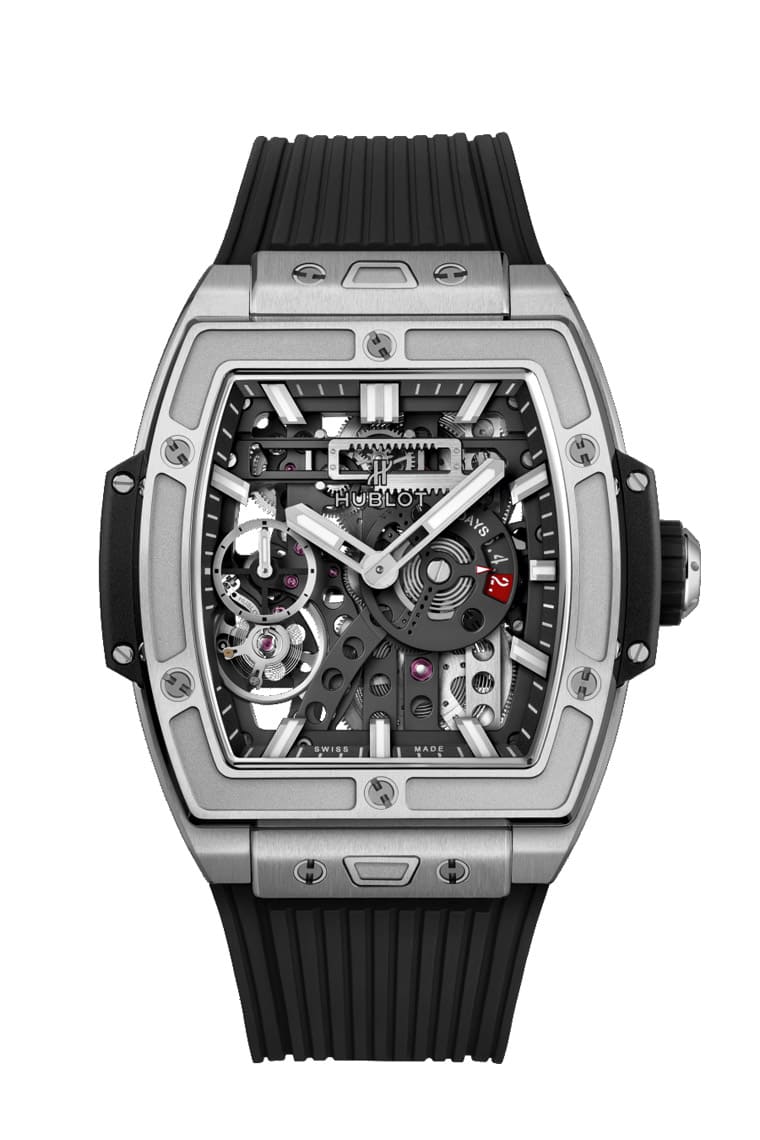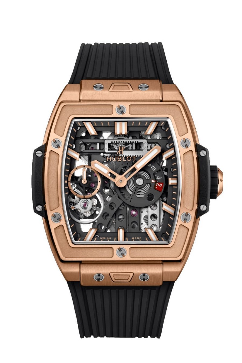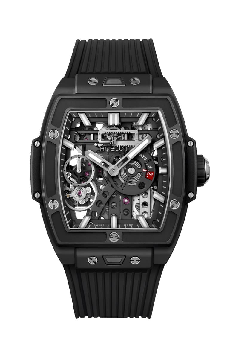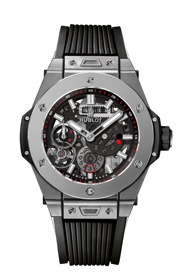 Meca-10機芯首度登場便是奠基於宇舶的招牌系列Big Bang大爆炸,腕錶直徑達45mm顯得大器豪邁,且錶殼還有品牌早在錶壇風行錶帶快拆系統前便已經研發出的One Click一鍵快拆設計,想要更換錶帶易如反掌。最初的Big Bang Meca-10採用黑色陶瓷錶殼,加上開面面盤上的機芯零件有不少鍍上黑色,整只錶黑色系的風格有助於突顯3點方向紅點動儲顯示的存在感,每當佩戴者望向開面面盤結構,不僅可以好好欣賞機芯零件之間的互動,也可以窺見宇舶設置在7點方向反轉於面盤側的擒縱系統,對於熱衷機械工藝的人而言無疑是大飽眼福的貼心設計。