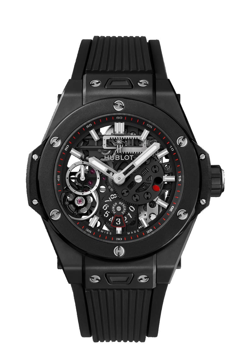 黑色陶瓷材質/HUB1201手動上鍊機芯/時、分顯示/動力儲存顯示/藍寶石水晶鏡面、透明底蓋/防水100米/錶徑45mm/限量500只/參考價:NT$ 684,000