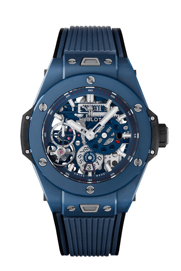 藍色陶瓷材質/HUB1201手動上鍊機芯/時、分顯示/動力儲存顯示/藍寶石水晶鏡面、透明底蓋/防水100米/錶徑45mm/參考價:NT$ 684,000