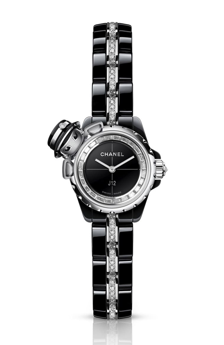 黑色高抗磨陶瓷、18K白金材質/石英機芯/時、分顯示/18K白金錶圈搭配18K白金香奈兒女士人偶,帽子及眼睛經手工上色黑漆,帽子鑲鑽1顆,約重0.01克拉/面盤外圍鑲鑽24顆,約重0.48克拉、鍊帶鑲鑽116顆,約重1克拉/藍寶石水晶鏡面/防水30米/錶徑19mm/限量55只/參考價:NT$ 1,452,000