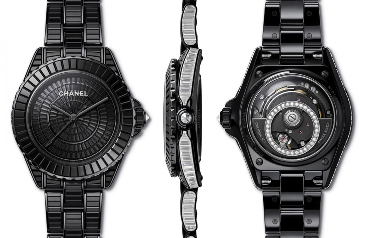 首款J12剛出道時就是以全黑風格示人,經歷20逾年後,這種純色的設計依舊是J12系列吸引人的關鍵點。J12 Black Star腕錶承襲香奈兒女士金句:「黑色突顯了本質,在其他色彩上強化了深度,使女性輪廓更為顯著。」它將過往品牌用於製作錶殼的高抗磨陶瓷轉化角色化為妝點腕錶外觀的裝飾材質,腕錶的錶殼與鍊帶本質為不鏽鋼材質,香奈兒特地在錶殼與鍊帶鑲上超過300顆的長階梯形切割黑色高抗磨陶瓷,而當視線轉移到腕錶側邊時,還會驚喜發現品牌與錶殼和鍊節側面鑲上的長階梯形鑽石,呈現出全黑色調與鑽石晶耀光芒的視覺對比層次。香奈兒製作J12 Black Star腕錶的過程仰賴品牌鑲嵌工坊內的4位頂尖工藝師,其完全以手工鑲嵌腕錶外觀的鑽石與陶瓷材質,包括事前雕琢鑽石與陶瓷以及後續採用錘擊鑲嵌技術將雙材質嵌入錶殼與鍊帶等工序相當費工,總計腕錶的鑲嵌工藝便需花費300小時,製作困難度與組裝複雜功能機芯有異曲同工之感。從錶款機芯零件的黑色塗層加上加上鑽石的自動盤這兩點看來,J12 Black Star腕錶並非只是外觀華麗的「視覺系」,其所搭載的機芯為香奈兒前兩年發表好評不斷的Caliber 12.1,內在規格堪比獨立製錶品牌般力求完美境界。