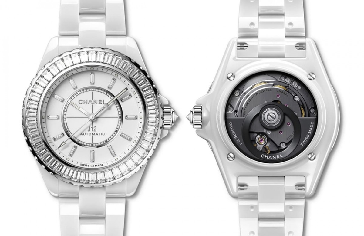 陶瓷與鑽石皆為J12發展歷程中不可或缺的兩大元素,因此2022年香奈兒也特別創作出J12 Baguette Diamond Bezel腕錶這款融合白色高抗磨陶瓷錶殼與鑽石裝飾的美型腕錶,而且還分別釋出搭載Caliber 12.1的38mm款式和搭載Caliber 12.2的33mm款式等不同錶徑尺寸供市場選擇。兩款J12 Baguette Diamond Bezel腕錶一律採用白色高抗磨陶瓷、白金錶圈與錶冠、並在錶圈鑲上46顆長階梯形切割鑽石,同時白色漆面面盤也都鑲上12顆長階梯形切割鑽石作為時標輔助時、分、秒針辨時。如此能讓白色陶瓷錶殼與鍊帶的組合額外散發由鑽石折射的明豔光芒,純白色調彷彿充滿生命力般閃閃動人。兩款腕錶背面盡皆配置透明底蓋露出香奈兒自製機芯,Caliber 12.1與Caliber 12.2動力儲存分別為70小時與50小時,實用性不在話下,且兩枚機芯都是經過瑞士天文台認證的作品,走時品質也能撐得起腕錶外觀的高顏值。