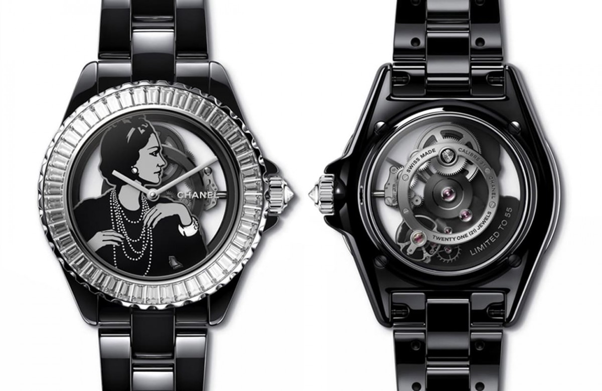 黑色高抗磨陶瓷、不鏽鋼材質/Caliber 3.1手動上鍊機芯/時、分顯示/錶圈鑲鑽46顆,約重5.46克拉、錶冠鑲鑽1顆,約重0.16克拉/18K白金鏤空面盤飾以香奈兒女士肖像/藍寶石水晶鏡面、透明底蓋/防水30米/錶徑38mm/限量55只/參考價:NT$ 8,133,000