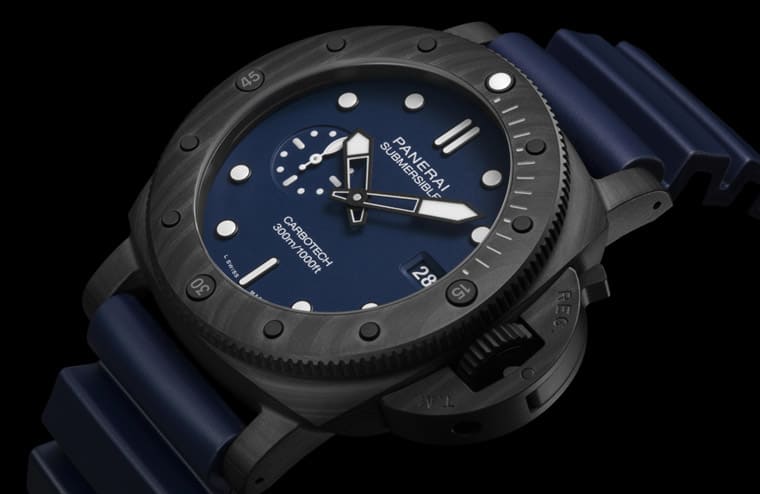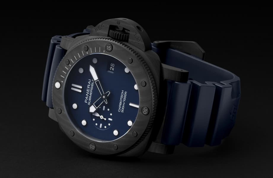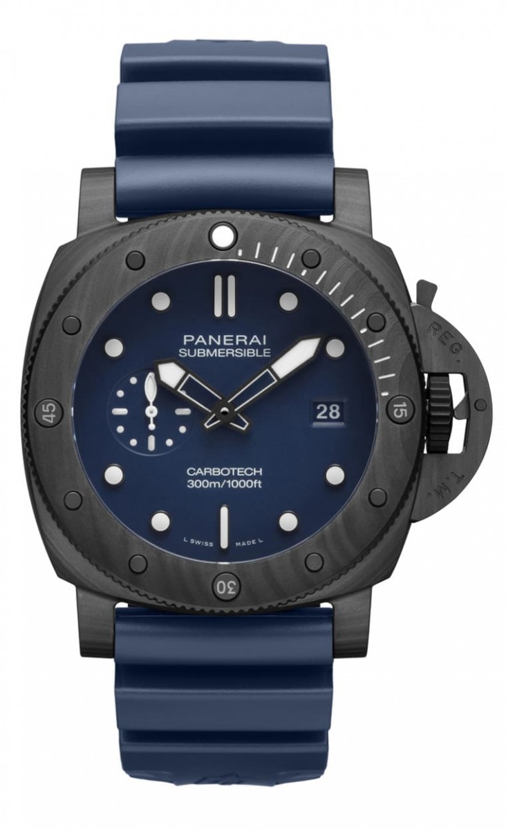 ▲Submersible QuarantaQuattro Carbotech™ Blu Abisso採用品牌獨家的Carbotech™錶殼搭配藍色面盤與橡膠錶帶。