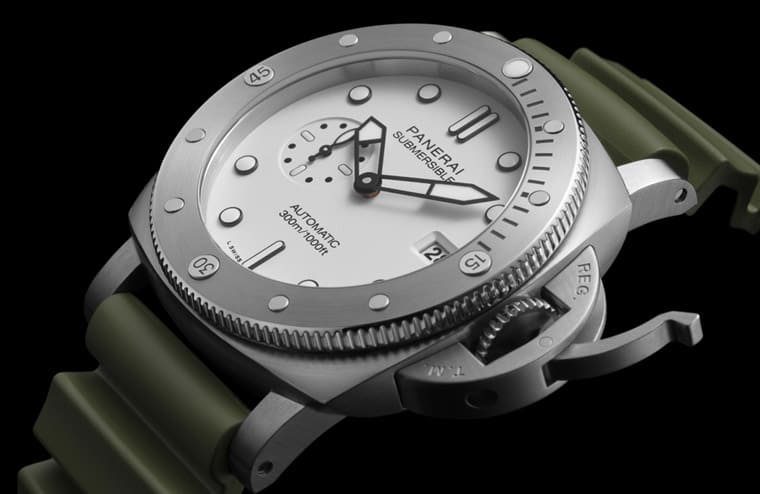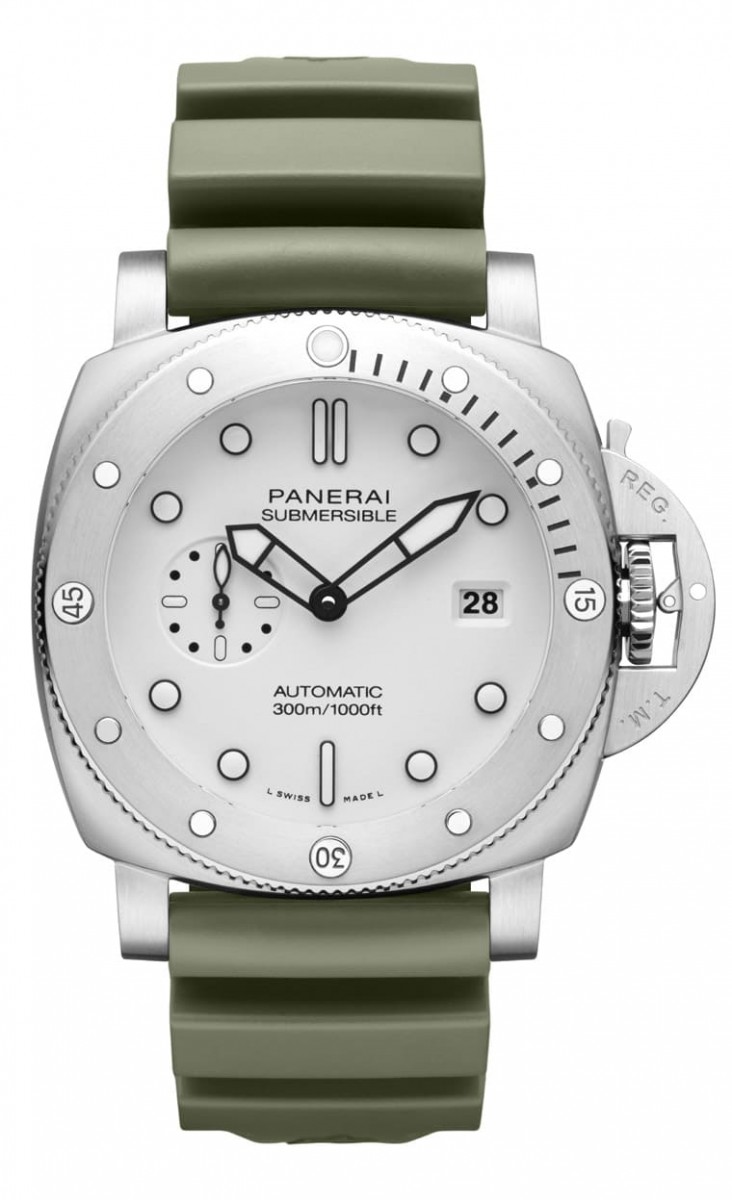 ▲Submersible QuarantaQuattro Bianco採用精鋼錶殼搭配白色面盤與軍綠色橡膠錶帶。