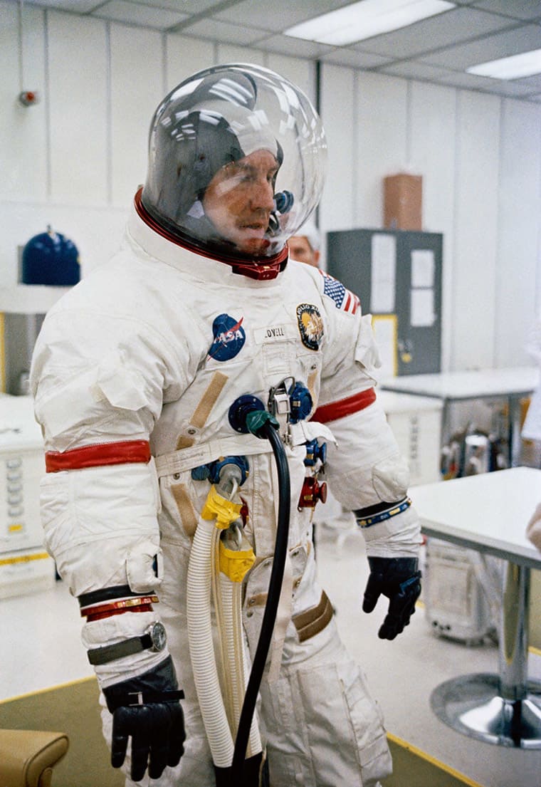 ▲NASA阿波羅13號任務指揮官Jim Lovell,當時他在太空衣外頭便戴著一只歐米茄超霸錶。