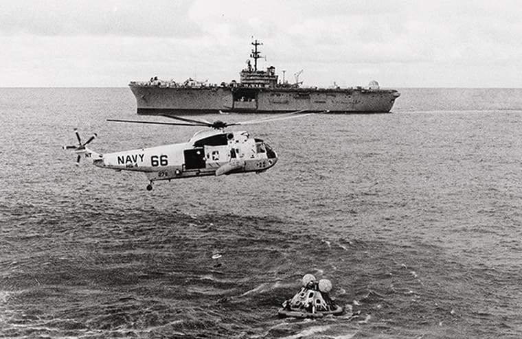 ▲阿波羅13號撐過關鍵14秒順利返航後,太空載具於1970年4月17日濺落在南太平洋上,三名太空人均安然無事。