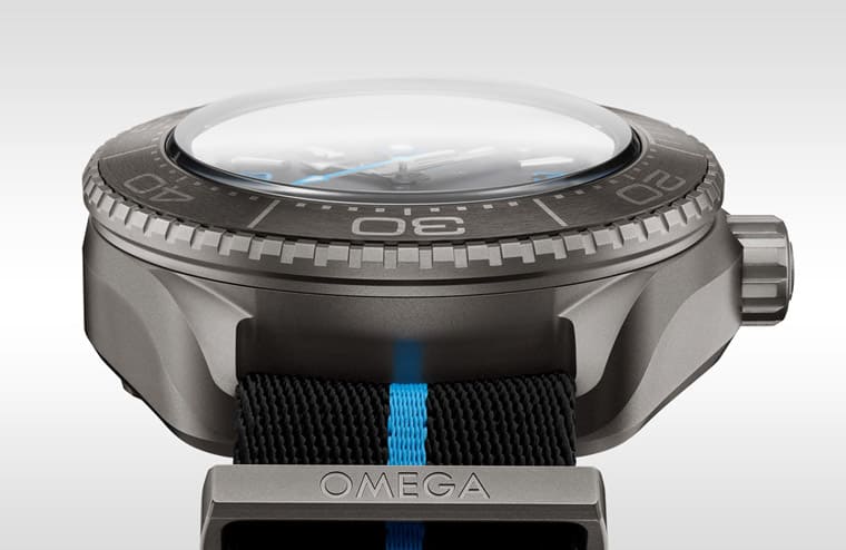 ▲Planet Ocean Ultra Deep家族中只有一款採用鈦金屬錶殼,同時它的陶瓷圈採用拉絲處理也和其他O‑MEGASTEEL版本不同。