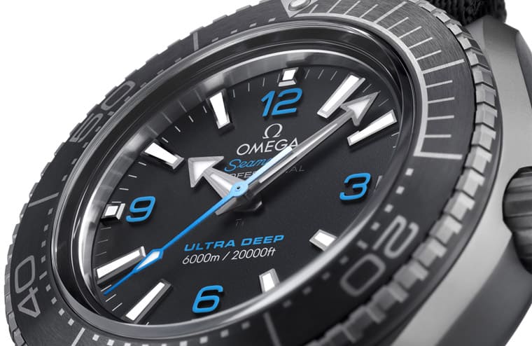現在的潛水錶採用陶瓷圈有點標準配備的味道,因此Planet Ocean Ultra Deep也不免俗地採用陶瓷材質製作錶圈,錶圈上頭皆以Liquidmetal™(液態金屬)製作潛水刻度,讓錶圈上的刻度與數字可以更持久耐用。鈦金屬款有別於其他四款的陶瓷錶圈經過拋光處理,它的陶瓷錶圈反而改成拉絲處理,所以它的黑色調看起來會比較淺一些,這明顯是從概念錶身上傳承的特色。不只如此,包括手錶的面盤細節顏色也都很有當年那款概念錶的味道,事實上Planet Ocean Ultra Deep家族還有一些採用漸層色調的款式,純以顏值來論,漸層面當然勝過鈦金屬款這種霧黑色,不過如果當年探險家在10,928米的水下創紀錄時都可以看清楚時間,那幾乎可以篤定鈦金屬Planet Ocean Ultra Deep視讀性絕對是品質保證,歐米茄於面盤3、6、9、12點方向設有水藍色的立體鑲嵌時標,搭配同色的秒針,在光線明亮的環境中強烈對比感看時間也是超清晰。