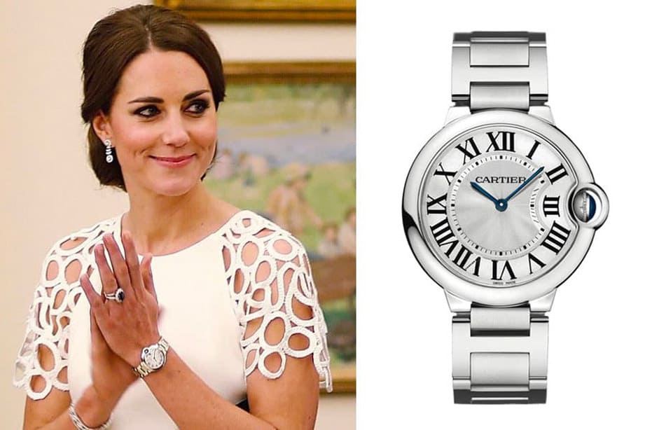 凱特王妃是許多人眼中的時尚品味教科書,她對於手錶的態度也是重質不重量,而且偏好一些經典雋永的設計——如同她的衣著也不以花俏大膽著稱一般。凱特王妃最常戴的錶是威廉王子送給她的33mm卡地亞藍氣球手錶,這款錶總是與王妃手上的藍寶石婚戒互相輝映,成為王妃外出時的兩大標準配備。