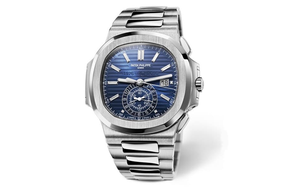 第一眼看到下面這張圖片時,不少人很快可以認出它是PATEK PHILIPPE百達翡麗前幾年為了慶祝Nautilus金鷹系列40週年發表的限量計時碼錶5976/1G。這款錶秉承系列第一款自動上鍊計時碼錶,搭載28-520C自動機芯,採用18K白金錶殼與鍊帶,同時錶徑也擴增至44mm這樣的大尺寸;手錶的藍色面盤在面盤上半部刻印上"1976-40-2016"字樣突顯紀念意義,同時它的時標還是鑲上鑽石加以升格奢華感,至於6點方向則有同軸的計分盤與計時盤,造型看起來簡潔俐落。
