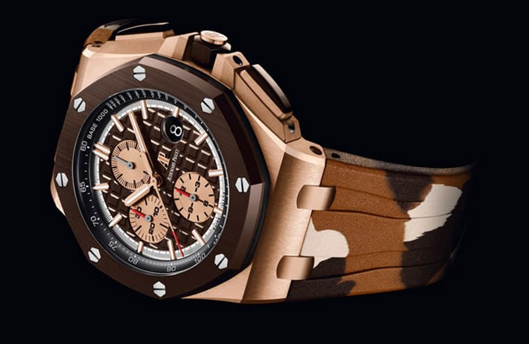 從照片上看來,LeBron James當天戴的應該是目前已經停產的皇家橡樹離岸型自動計時碼錶26401RO,這款錶同樣是玫瑰金材質,搭配棕色陶瓷錶圈與同色的Méga Tapisserie格紋面盤,特別之處在於手錶搭配了沙漠迷彩般圖案的橡膠錶帶。迷彩這個主題是前幾年愛彼創作ROO手錶時的重要元素,當時品牌接連推出了幾款採用彩色陶瓷錶圈搭配迷彩圖案膠帶的ROO計時碼錶,一上市就受到許多收藏家青睞,包括LeBron James也對這種突顯年輕活力的設計很感興趣,趁著到摩納哥欣賞F1賽事的時候秀出這只愛錶,也讓這張體壇兩大巨星的世紀合照多了些讓錶迷茶餘飯後討論的焦點。