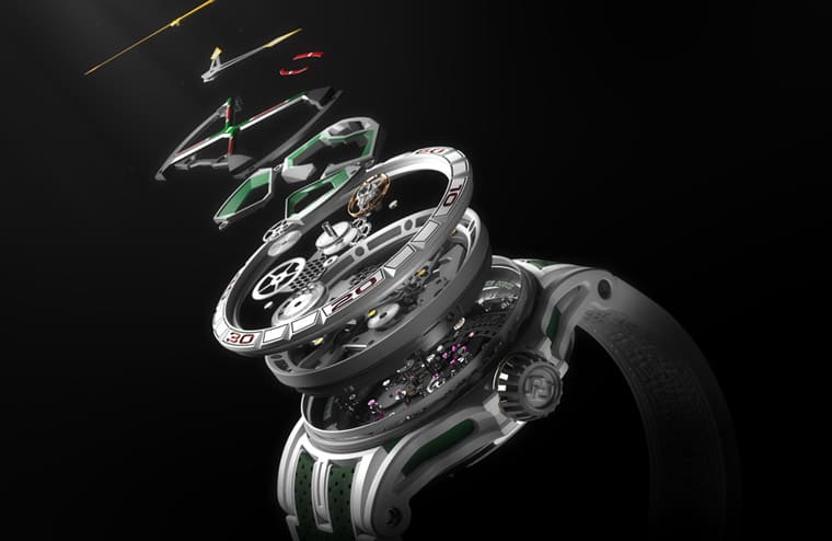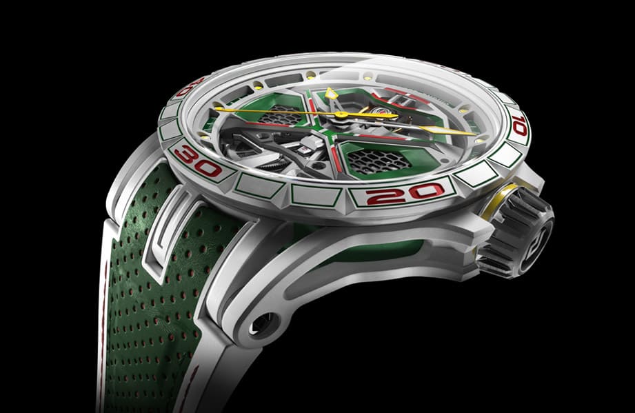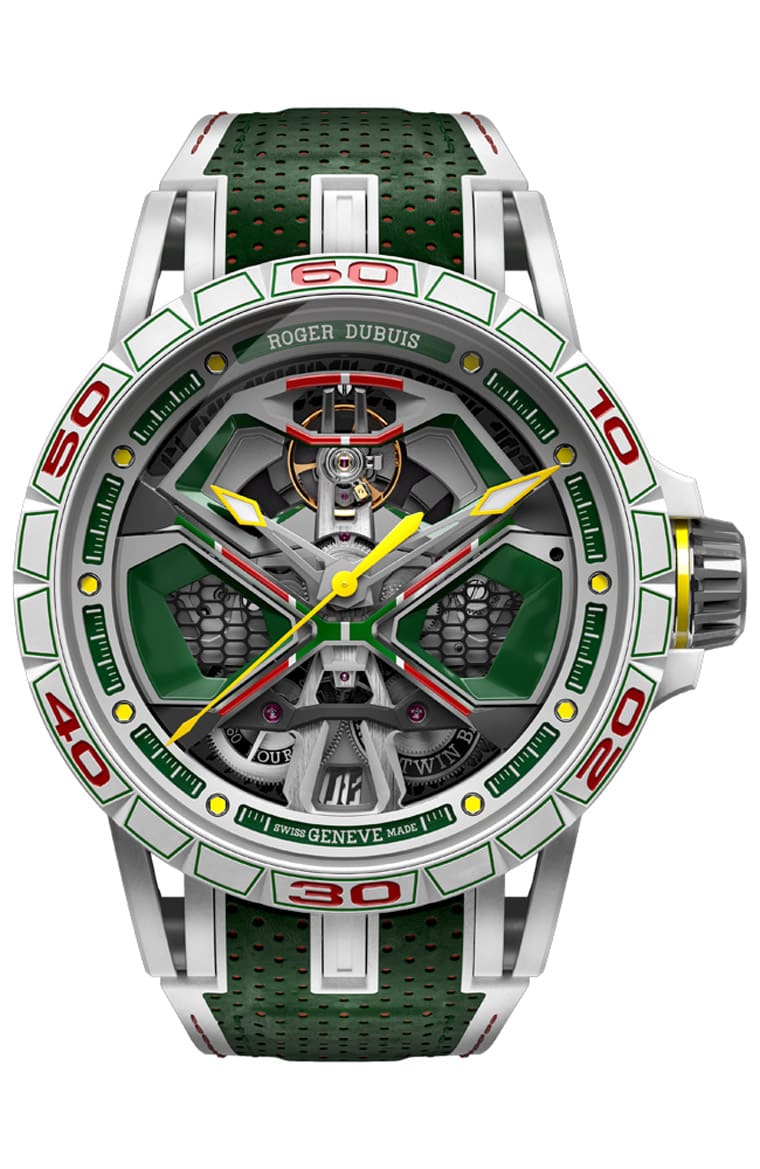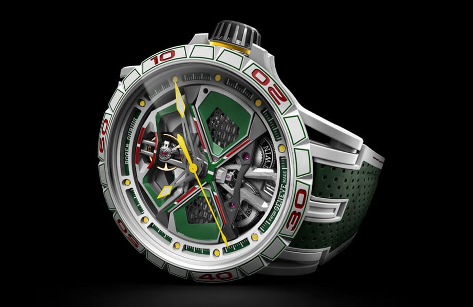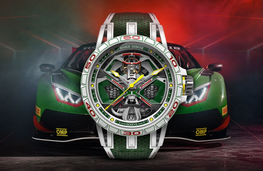 ROGER DUBUIS羅杰杜彼為了慶祝成為Goodwood Festival of Speed古德伍德速度節的合作品牌,特別創作出一款Excalibur Spider Huracán單擺輪手錶以資紀念,透過材質、配色的細節調整,賦予錶款截然不同的搶眼風貌。