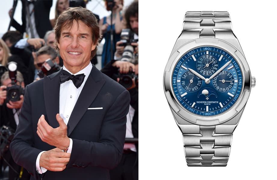 阿湯哥在《捍衛戰士:獨行俠》上映前現身坎城影展受到全場影迷歡呼,他穿著十分正式的西裝,袖口偶爾會露出裡面戴的錶,再看仔細點那是江詩丹頓2021年發表的Overseas超薄萬年曆白金款,它是同款中第一次採用白金材質的新嘗試,搭配藍色面盤相當高雅大方。手錶的面盤佈局展現出工整對稱的設計思維,包括3點方向的日期顯示、9點方向的星期顯示、12點方向的月份與閏年顯示等等,另外6點方向的扇形視窗也還有月相顯示。錶款厚度僅8.10mm,戴在手上相當輕盈,且它雖然帶有休閒風格,但搭配正裝還是非常適合,成為阿湯哥在紅毯上引人注意的亮點配件。