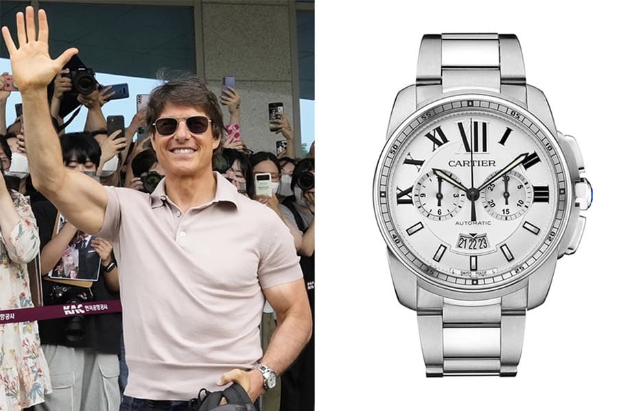 而在電影即將上映之際,阿湯哥連同劇中主要演員如珍妮佛康納莉(Jennifer Connelly)、喬漢姆(Jon Hamm)、麥爾斯泰勒(Miles Teller)等人前往墨西哥城宣傳時,手上改換上一款比較令人驚訝的錶。因為那是卡地亞2013年發表、目前已經停產的Calibre de Cartier不鏽鋼計時碼錶,這款手錶搭配金屬鍊帶,銀色面盤帶有品牌經典的羅馬數字時標與幾何造型時標,並且在面盤下方採用顯示前後三天的日期窗,算是滿有個性的設計,只是手錶在推出一段時間後並未大鳴大放,如果放在現今鋼殼運動錶當道的時代,或許受到的討論會更廣。
