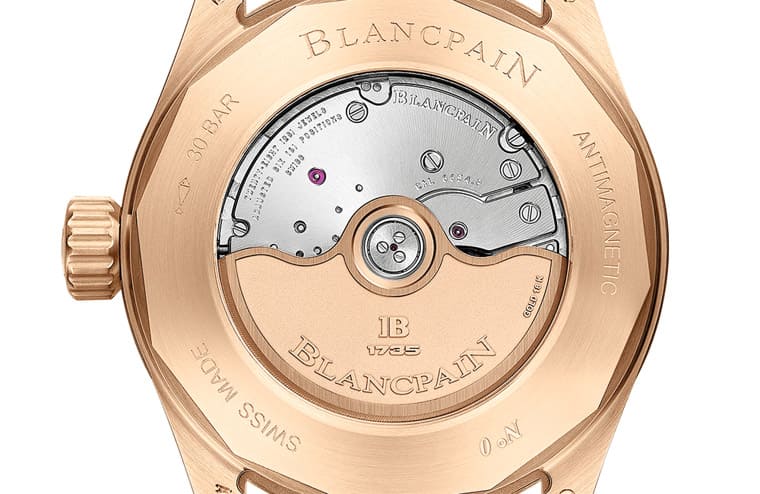 底蓋可見6654.P機芯的真面目,鈦金屬版本的機芯自動盤採用碳灰色NAC塗層修飾展現運動感,至於玫瑰金版本自動盤又改成玫瑰金材質,配合兩種錶殼材質蘊含的種種細節變化使得兩款錶在相同的內外設計基礎中,衍生出同中求異的自我風格。6654.P機芯除了帶有進階功能性、動力儲存達到相對實用的72小時之外,寶珀還替其配置一套安全系統,錶主在任何時候都可以安心地調校手錶,不像一般日期錶有所謂的調時禁區這種事,將潛水錶的日常佩戴實用性推展到另一個新境界。