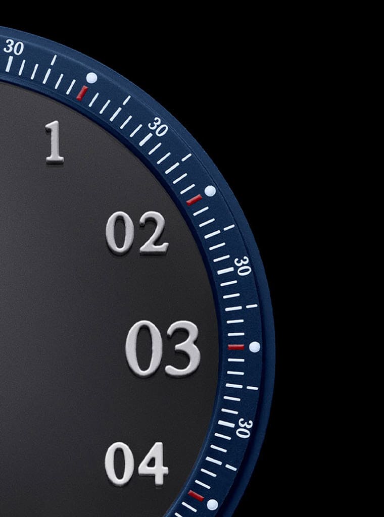 改裝錶品牌為了呼應手錶的單指針設計而首次採用雙材質面盤,包括外緣的金屬刻度環以及內側的藍寶石盤,同時藍寶石盤上還鑲有金質立體阿拉伯數字時標,其中2~9點前面額外多加一個”0”的設計很有特色。藍寶石面盤可以讓底下的機芯構造被看得清楚,例如12點~1點方向的發條盒就很引人注目。