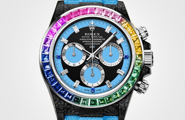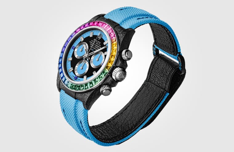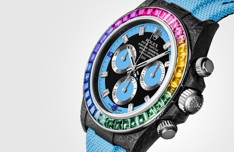 產品推陳出新向來迅速的比利時改裝品牌Designa Individual(DiW)發表以勞力士Daytona為基礎的新作Rainbow Blue Carbon。顧名思義手錶具有兩大特徵,一是錶殼採用輕量化的碳纖維材質,二則是錶圈鑲上五彩繽紛的天然寶石形成彩虹圈,詮釋出與勞力士原廠彩虹圈116595RBOW有別的炫彩魅力。