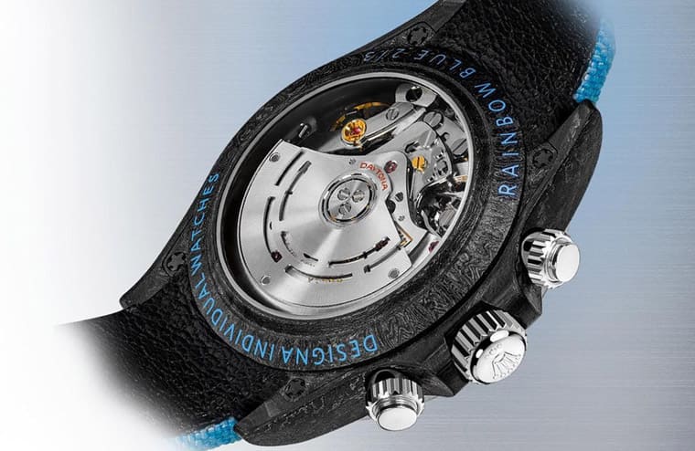DiW製作Rainbow Blue Carbon時幾乎把手錶外部零件都重新換過一輪,大概只剩下計時按把和錶冠沿用原本的零件,因為勞力士並沒有推出過碳纖維錶殼的Daytona,所以改裝錶品牌必須自己研究手錶的線條,並用碳纖維材質依樣設計出與Daytona一致的殼型,成形後的碳纖維錶殼外觀具有不規則紋路,看起來非常別緻又有個性。