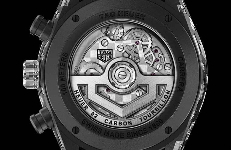 錶背透明底蓋露出H02 Tourbillon Nanograph這枚經過瑞士天文台認證的機芯面貌,這枚機芯蘊含泰格豪雅研發的碳游絲,其具有優異抗磁性、抗震性、抗溫度變化的穩定性,對於提升手錶的走時精準度助益良多。這枚機芯經過大量手工打磨修飾,並於底板加上獨特的格紋打磨,而且細看機芯自動盤還會發現其融入泰格豪雅的盾形標誌概念,機芯動力儲存達65小時,以同時具備雙重複雜功能的手錶而言,這樣的動能顯得相對充裕。