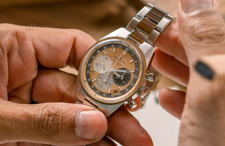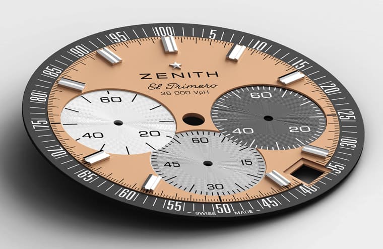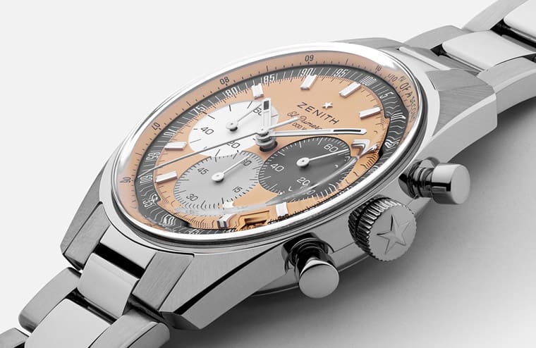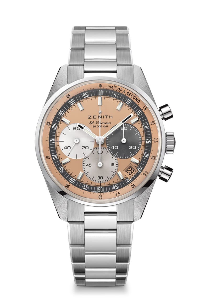 ▲Hodinkee特別替手錶選擇偏橙色調的鮭魚色面盤,搭配白、淺灰與深灰色小錶盤,開創出El Primero家族前所未見的視覺衝擊感。