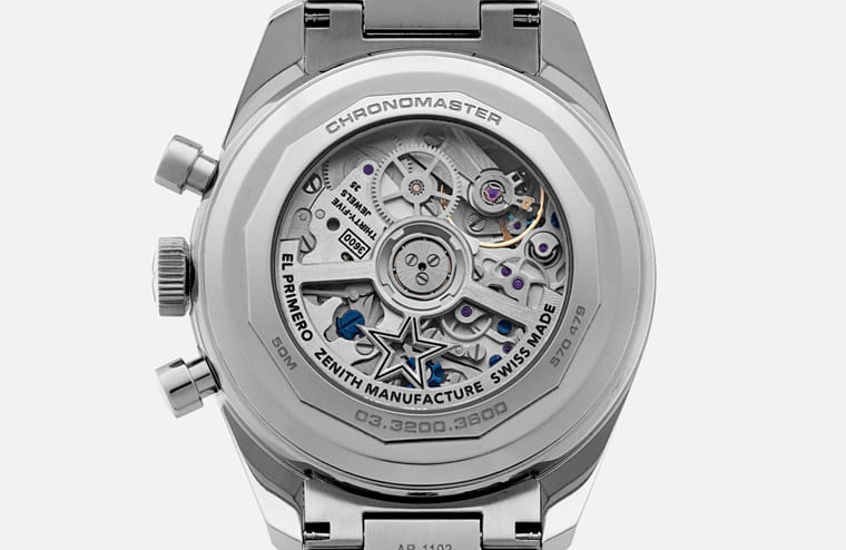 ▲錶背透明底蓋露出El Primero 3600機芯,這枚機芯擺輪震頻達5Hz、動力儲存約60小時,同時面盤的中央計時大秒針還是10秒繞一圈,突顯手錶高震頻帶來的精準度。