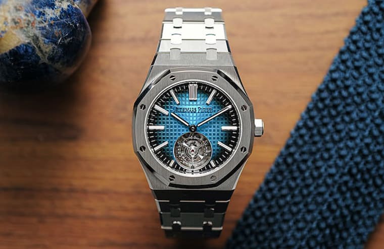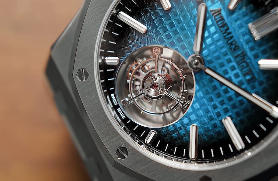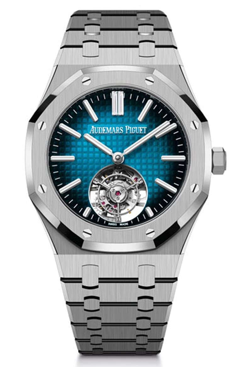 ▲藍綠色漸變面盤首度出現在皇家橡樹系列的飛行陀飛輪上,搭配經典Tapisserie格紋美感獨具。Source:Hodinkee