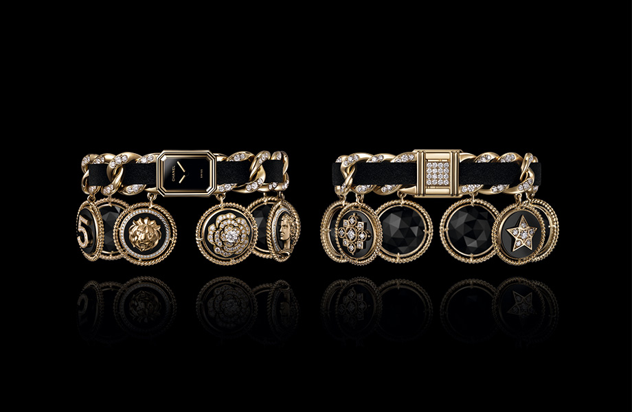 2022年Première限定腕錶系列當中,限量5只的Première 幸運符手鍊錶,採用18K黃金打造錶殼,搭配塗覆共15層黑色漆面錶盤,形成完美光滑、深邃均勻的純黑面盤。製錶過程最具挑戰性的環節在於腕錶綴上六枚墜飾,墜飾周圍皆環繞一圈18K黃金扭索紋,正面飾以香奈兒最具代表性的符碼:像是鑽石排列的數字 5、手工微雕的獅子、粒面鑲嵌的山茶花、以18K黃金浮雕工藝的香奈兒女士側面人像、脫蠟鑄造法的彗星、爪鑲工藝製成拜占庭圖騰,墜飾背面則是刻面縞瑪瑙,處處可見精湛細膩的寶石鑲嵌及雕刻工藝。