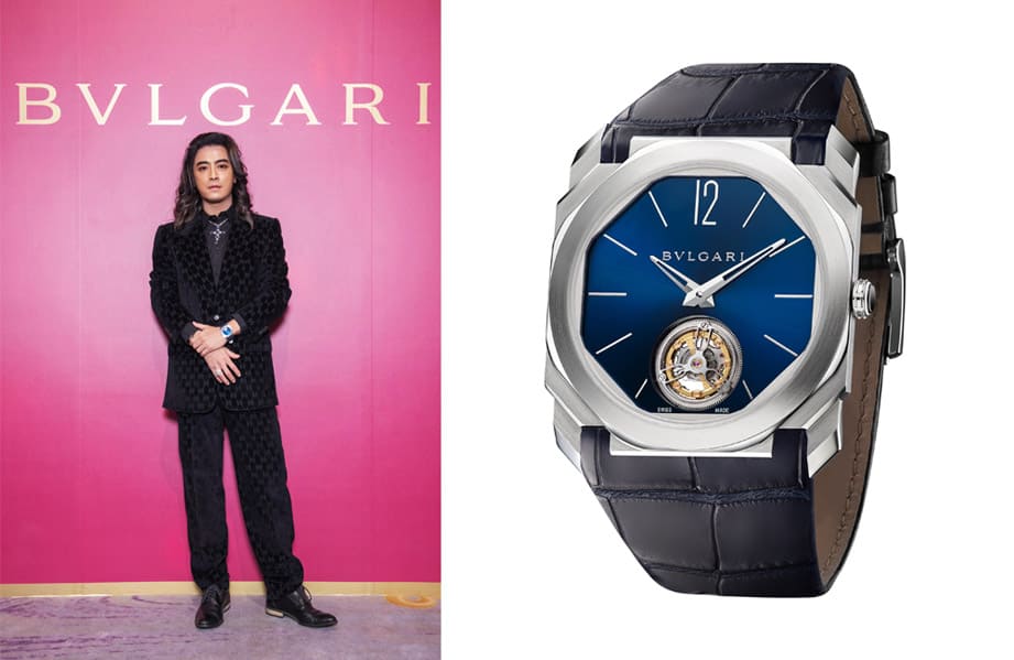 温昇豪以一席深色西裝搭配Serpenti系列頂級縞瑪瑙與鑽石項鍊,並佩戴Octo L'Originale系列鑲鑽腕錶及藍寶石戒指,紳士魅力與腕錶的高雅氣質相呼應。而Toro選擇的是Barocko系列頂級彩寶與鑽石項鍊、Octo Finissimo超薄陀飛輪腕錶,和他的雅痞型男風格一拍即合。