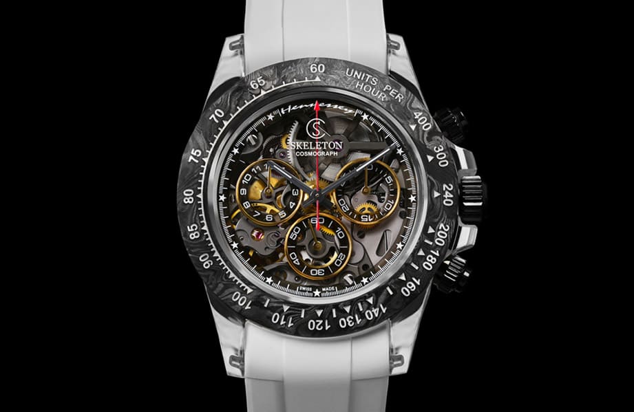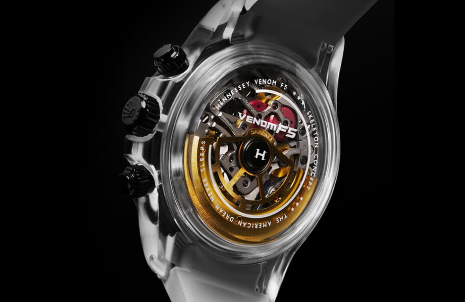 Venom F5 Concept手錶不只是採用鏤空處理與藍寶石面盤,包括錶殼也要呈現透明效果,為此SKELETON CONCEPT花了500個工時來製作造型與Daytona一致的藍寶石錶殼,此外錶殼內部,如採用鏤空處理並在零件表面鍍上無菸煤色的4130機芯光是在設計和鏤空過程就經歷多次修改,最終改裝錶品牌定案以24K金製作三眼小錶盤邊框與機芯自動盤,同時連時、分指針也改用黑金材質營造跑車王者的氣勢。