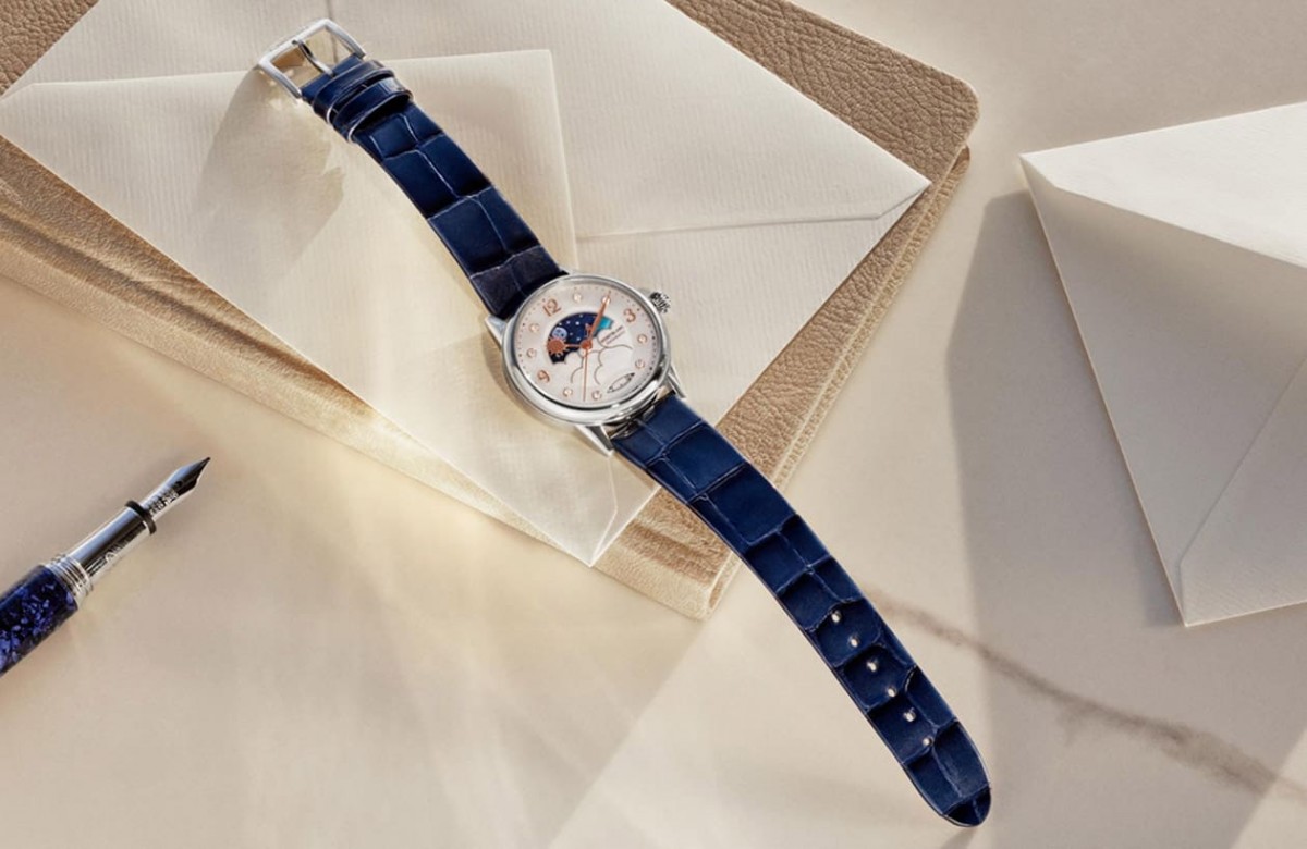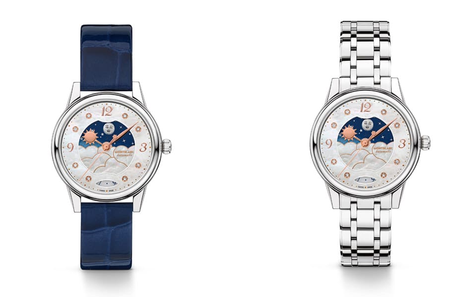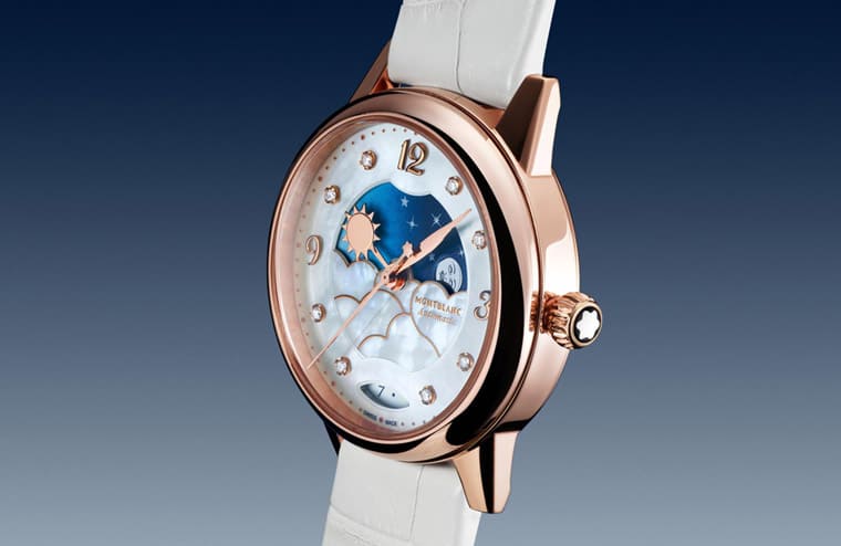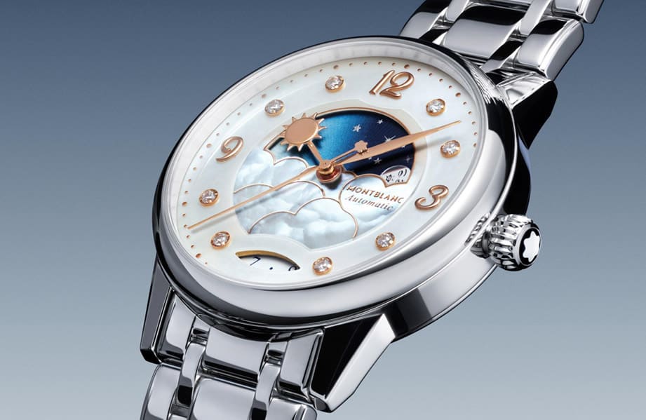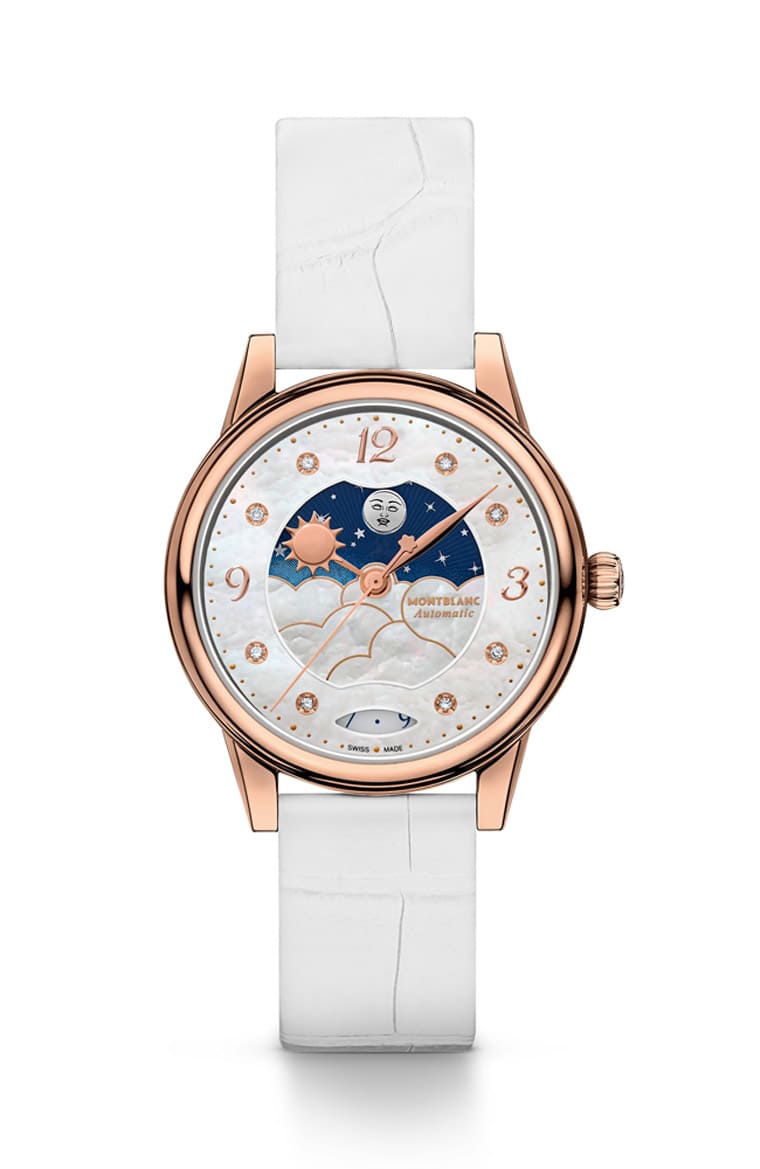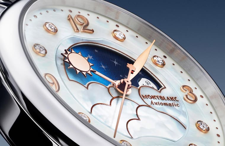 珍珠母貝雲朵周遭以精緻的鍍玫瑰金線勾勒出有機輪廓,晝夜顯示中的月亮圖案為鍍銠表面,散發銀色魅力,伴萬寶龍甚至替月相加上女性的柔媚表情,讓月亮在藍天轉盤的星星背景烘托下憑添幾分嬌媚氣韻。手錶搭配太陽造型的時針、葉形分針,以及末端平衡器飾有萬寶龍六芒星標誌的秒針,除了時針有晝夜顯示的延伸功能,其實秒針也扮演了流星劃過星空的角色,讓手錶面盤多了許多聯想空間。