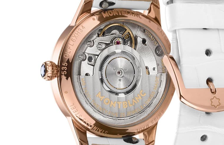 ▲不論材質、尺寸錶背皆採透明底蓋設計,讓人一窺MB 24.20自動機芯樣貌。