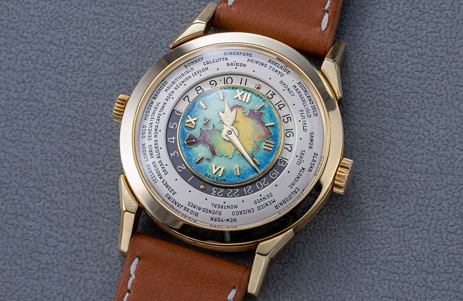 1953年製,百達翡麗以黃金材質製作並搭配雙錶冠設計,面盤則是一幅用掐絲琺瑯工藝繪製的歐亞大陸地圖。Ref. 2523據稱當年製作數量不超過36只,因此能留存的現在的都是收藏家眼中的珍寶,其中面盤是琺瑯面又畫上歐亞大陸地圖的數量更僅有3只,當它2021年5月出現在富藝斯日內瓦拍賣會上,引起了收藏家激烈競標,一舉締造驚人價格。