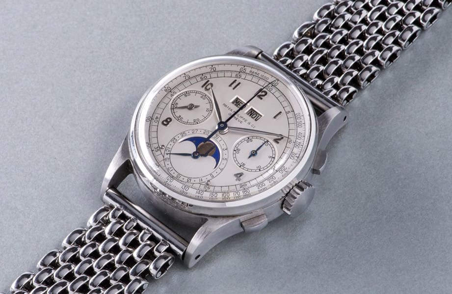 連續兩款型號都是PP的1518,不過兩只錶外觀乍看像是兩只錶,因為排名第三的這款乃是採用不鏽鋼材質製作且配置金屬鍊帶,眾所皆知百達翡麗的複雜功能錶款幾乎都是用貴金屬打造,只有極少數是以不鏽鋼錶款製成。Ref. 1518除了總產量稀少,也多為K金款,玫瑰金款則不到二成,而不鏽鋼版本據知僅有四只,其珍稀程度可見一斑。這款錶在2016年11月於富藝斯日內瓦拍賣會售出,一度成為當時拍賣身價最高的手錶。