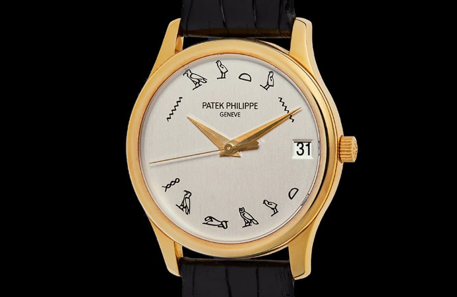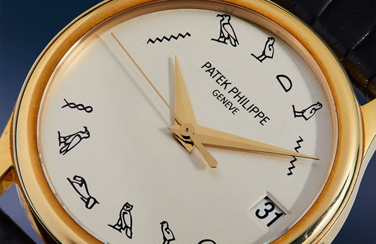 但其實代表時標的那些圖案並非純粹的裝飾圖案,其實它們是古埃及的象形文字。同一只錶其實2014年就曾登上蘇富比賣會,當時這只黃金款和另一只同型號但採用鈦金屬製作的手錶面盤都換上了象形文字。在此前情提要一下,3998J-013 Hieroglyph “Helmut Newton”當年是以53,125美金的代價成交,所以這次富藝斯開出的估價也是有所根據,在2014年當時像這種面盤採用象形文字時標的PP手錶非常非常罕見,甚至人們原本也不清楚這些象形文字有什麼意義,還以為它們只是用象形文字代表1~12的概念。