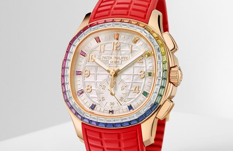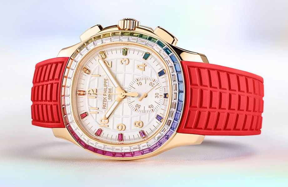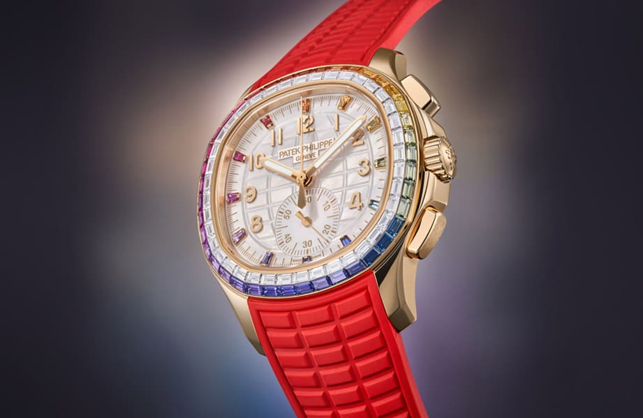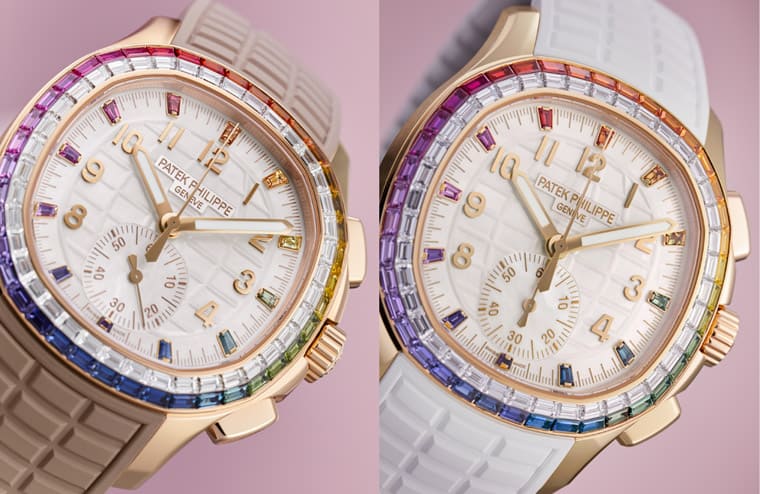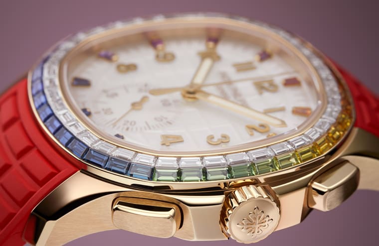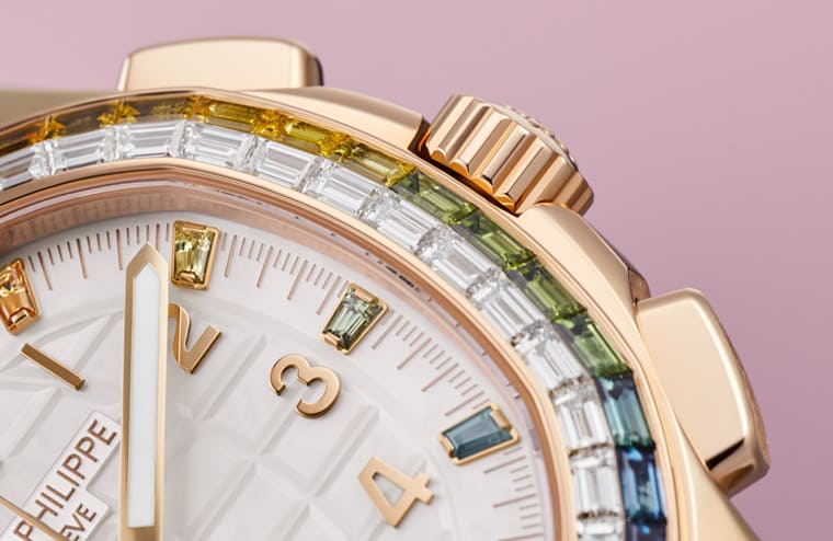 錶殼造型大致上延續Aquanaut的設計精髓,不過這次百達翡麗再度發揮他們在珠寶鑲嵌工藝層面的專長,別開生面地採用各種顏色的藍寶石搭配鑽石鑲於7968/300R-001的錶圈上,塑造出市面上罕見的「加強版」彩虹圈造型。7968/300R-001於八角造型錶圈外緣鑲嵌40顆矩形切割彩色藍寶石,每顆寶石都由手工精挑細選,確保顏色之間達到細緻漸變效果,從12點方向開始由紅色、橘色,一直到藍色、靛色與紫紅色等,剛好形成如彩虹般的七彩繽紛色調。而在錶圈內緣,百達翡麗還加碼另外鑲了40顆頂級Wesselton極白無瑕鑽石,與彩色藍寶石來個內外呼應,這是目前市面上各家彩虹圈手錶所未曾見到的創意,鑽石的光芒輝映彩色寶石的色調相得益彰,而為了盡可能釋放寶石與鑽石的光芒,PP採取隱形鑲嵌工藝讓寶石與鑽石周遭看不到固定鑲爪,手錶整體的視覺感受也更為流暢簡潔。