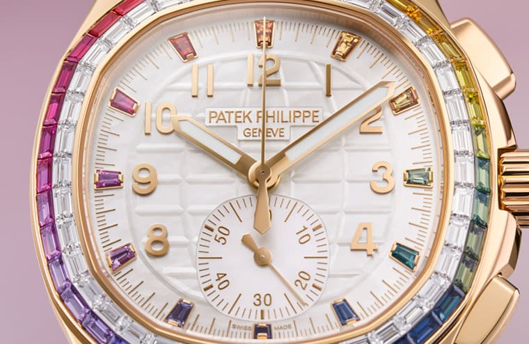 ▲珍珠母貝面盤維持Aquanaut系列特色的格紋裝飾,同時12方位也鑲了12顆不同顏色的彩色藍寶石,呼應錶圈的彩虹圈設計。