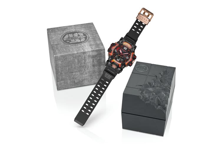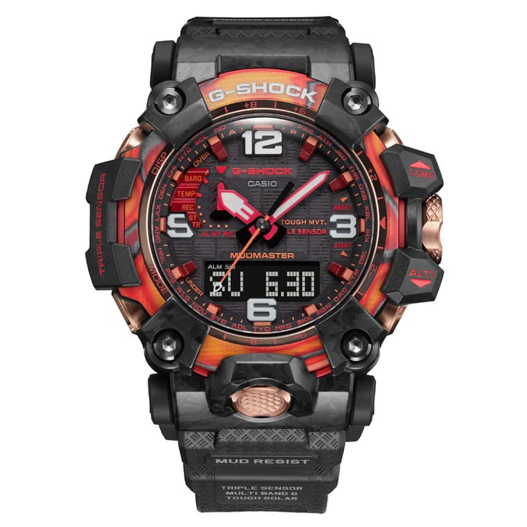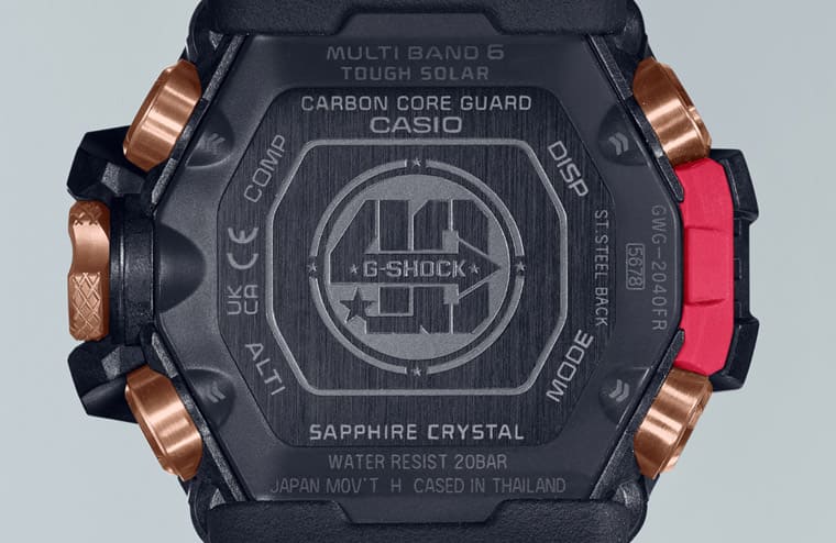 GWG-2040FR-1A奠基於Master of G MUDMASTER家族,錶款除了錶圈也與MTG-B3000FR-1A採用相同材質,它還配置藍寶石水晶鏡面與印有太陽閃焰的面盤,至於底蓋在經過黑色IP處理後印上了G-SHOCK 40週年的專屬Logo,而其他金屬零件則是採用粉金色IP處理,搭配玫瑰金IP處理的錶扣、錶帶環、按鈕、錶冠等,前衛酷炫之餘,也多了幾分紀念錶的珍貴意義。