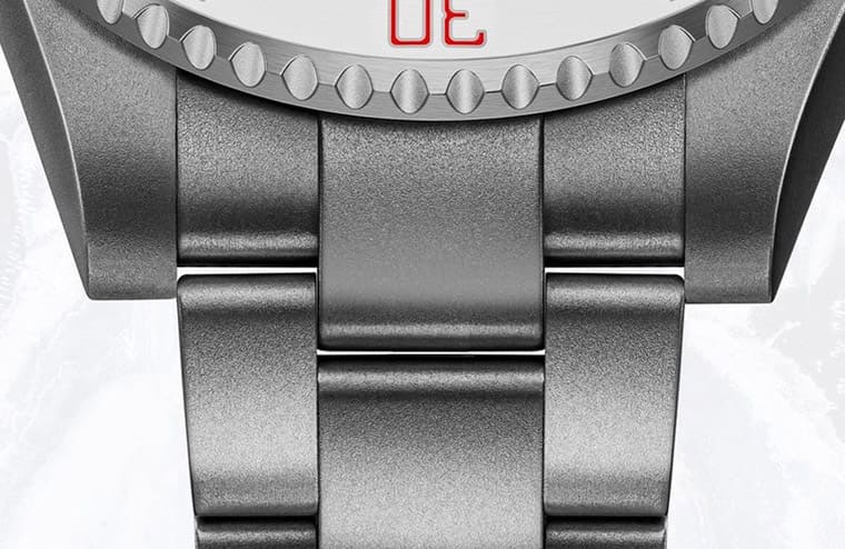 DiW以126610LN為基礎,手錶的不鏽鋼錶殼與鍊帶等零件全部重新噴砂處理,呈現比原廠手筆更強烈的粗獷運動感,而為了詮釋冰川的設計主題,改裝錶品牌別出心裁地將手錶的陶瓷錶圈改成白色,並用紅色琺瑯填入10分單位刻度。採用紅色細節有點像是探險人員身上穿戴的衣物配備,這種顏色在一片白茫茫的冰天雪地中特別好認,放在手錶的白色陶瓷錶圈上視覺對比感當然也非常強烈。