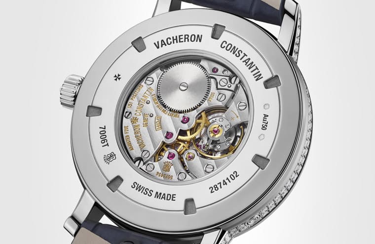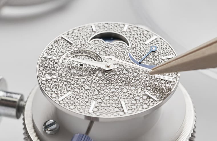 錶款的重頭戲在於面盤的「雪花鑲嵌」工藝,製作過程中要求經驗豐富的珠寶工藝師對即將嵌入鑽石的空間瞭然若指掌,最具挑戰的部分在於需要沿著月相扇形視窗的外緣以及動力儲存顯示窗的弧形輪廓進行鑲嵌,另一方面又還要確保鑽石與白金時標完美相融,總計面盤共鑲上548顆圓形明亮式切割鑽石,它們的尺寸介於0.7mm~1.5mm之間,看起來沒有一定秩序卻又和諧細緻地排列得宜,如果沒有一流的工藝技術,很能鋪陳出Traditionnelle月相錶的華麗面盤。