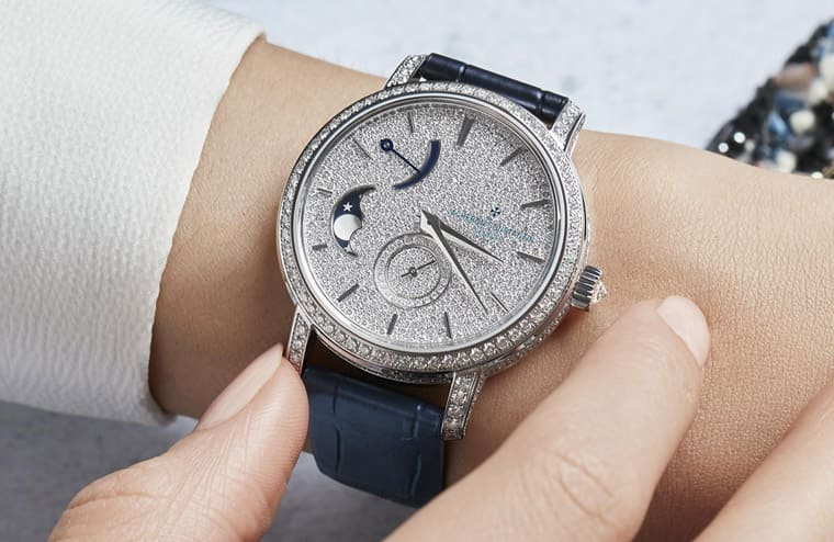 ▲Traditionnelle月相錶採用白金錶殼,江詩丹頓精心於錶殼內外鑲上多達795顆美鑽。