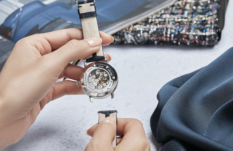 Traditionnelle月相錶搭配深藍色鱷魚皮錶帶,配備鑲嵌21顆圓形明亮式鑽石的白金針扣,呼應手錶的高雅氣質。而由於品牌導入錶帶快拆系統,佩戴者透過錶帶背面的滑動裝置就能輕鬆拆下與組裝錶帶,隨時轉換手錶風格,讓錶頭光芒耀眼的珠寶鑲嵌工藝也能隨著錶帶輝映多變風情。