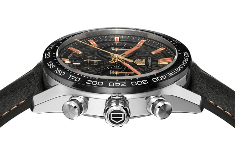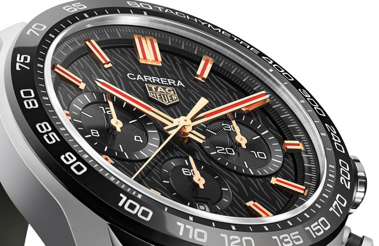 除了面盤精心設計的裝飾紋理,品牌另將時標、指針等零件鍍上玫瑰金色,至於時標與指針上的夜光物料則為紅色,由這些細節點亮手錶的年味。此外注意到面盤12點方向的泰格豪雅Logo也換上了黑底金色,由此再度暗示手錶與一般版有別的特別版身份。