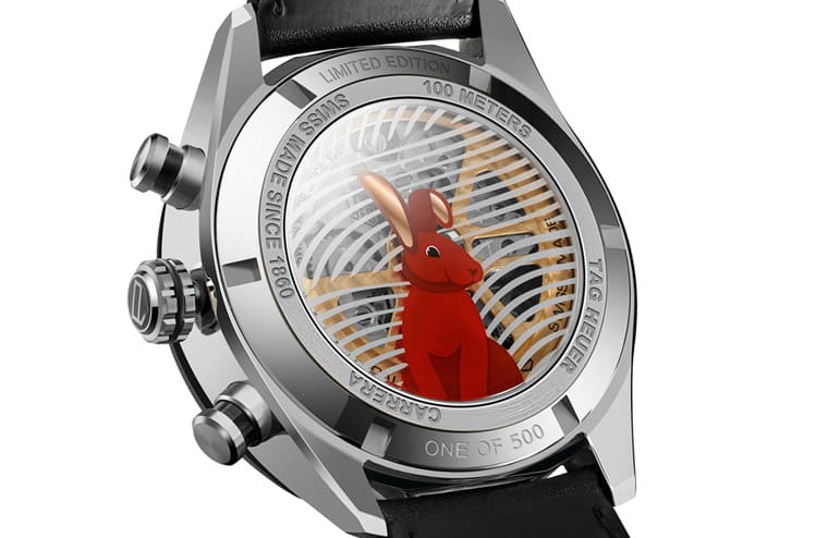 Carrera兔年限量計時碼錶以泰格豪雅招牌的賽車錶系列為基礎,並融入農曆「兔年」為主題,兔子在大中華區傳統文化中象徵智慧、機靈與敏捷等特質,品牌再於手錶中導入黑、紅、金三色來詮釋手錶外觀。其中紅色原本就是和過農曆新年最相關的色彩,至於黑色與金色的搭配則是放諸海外皆通行的佳節意涵,金色貴氣又吉祥,與紅色搭配相得益彰,經由黑色的烘托,讓整只錶散發低調的喜慶感。