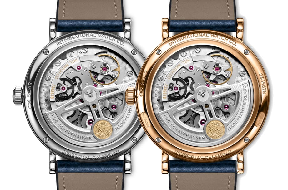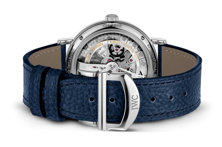 ▲錶背透明底蓋露出82650機芯,其蘊含克勞斯萬年曆系統與比勒頓上鍊系統等兩大精華設計,體現IWC製錶工藝水準。
