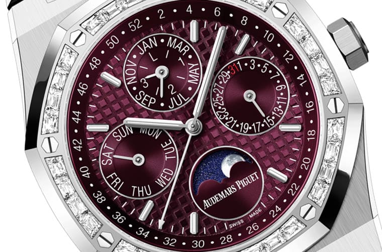 新款皇家橡樹萬年曆的Grande Tapisserie大型格紋面盤也跳脫目前的配色框架,啟用紫紅色調突顯手錶的華麗個性,搭配白金時標和指針對比強烈且易讀性也高。而手錶面盤展示的功能同樣一目了然,包括3點方向的日期顯示、9點方向的星期顯示、12點方向的月份/閏年顯示,加上6點方向的月相顯示等,同時面盤外緣的刻度搭配中央指針則能指示一年內的週數,這是AP這款萬年曆的一大特色,同時手錶的各項顯示也可藉由錶殼兩側的隱藏式按把各別調校。