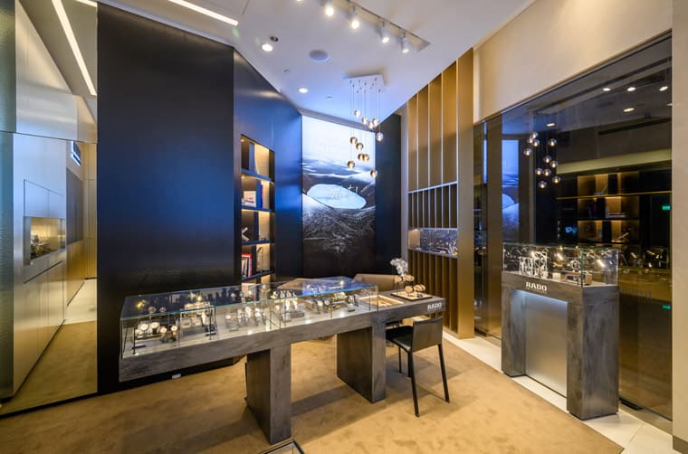雷達表台北101旗艦店打破品牌以往黑色簡約調性,改以大量金色與大地色系輔以立體紋理細節營造整體明亮溫暖的室內空間,同時也設置Lifestyle Corner,以設計師傢俱打造賓至如歸的感覺,體現出品牌在材質及設計領域的專長。