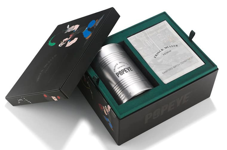 而不只手錶本身,FRANCK MULLER和Bamford就連錶盒組合也設計得很用心,黑色錶盒上印有大力水手的經典圖案,掀開錶蓋後會注意到還有一個菠菜罐頭造型的錶盒,從中取出Vanguard x Popeye大力水手限量版彷彿也將人拉進記憶漩渦,讓人拿到手錶就像吃下菠菜般感到元氣滿滿,而在菠菜錶罐旁邊還有另一個驚喜,那就是漫畫家Randy Millholland精心為本次聯名合作而專門創作的一幅原創漫畫,內容敘述卜派和Swee’Pea進行了一趟倫敦-日內瓦之旅,既串連起這項聯名企畫中各公司的淵源,也可以和手錶面盤的圖案相互呼應,埋梗埋得相當用心,不過這幅原創漫畫並非一張海報式的紙張,而是被印在超細纖維布上,兼具擦拭手錶的附加功能,讓錶主拿到時倍感開心。