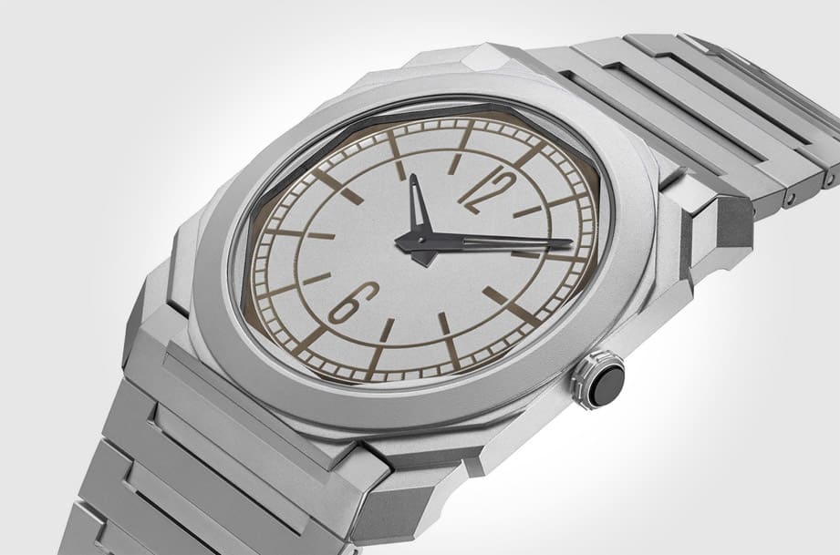 Bacs & Russo資深顧問Aurel Bacs及歐洲暨中東鐘錶部門負責人Alexandre Ghotbi談到雙方這次的合作結晶時表示,在設計過程中他們與寶格麗來回提出許多材質與面盤設計概念,但是在保有手錶超薄結構與經典八角造型多切面錶殼的前提下,最終決定將設計重點放在面盤上,因此才會衍生出最終呈現分割造型的面盤佈局,期能突顯手錶設計的對稱性,甚至還蘊含向義大利建築致敬的深層意義。雙方這次選擇捨棄小秒針,寫下Octo Finissimo系列的歷史新局,目的在於讓佩戴者更能聚焦在時標與刻度圈等元素上,佩戴者不妨仔細看面盤的時標與刻度,會驚喜發現其色調在不同角度與光線下會呈現黑-灰-黃銅的多變效果,讓乍看僅具基本二針顯示功能的手錶實則富有細膩賞玩逸趣。